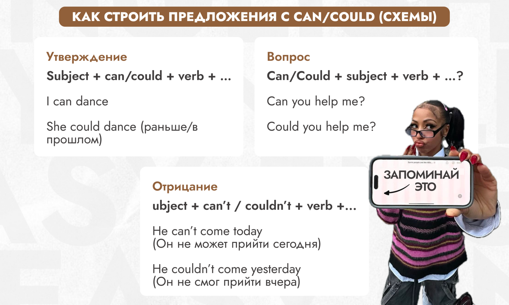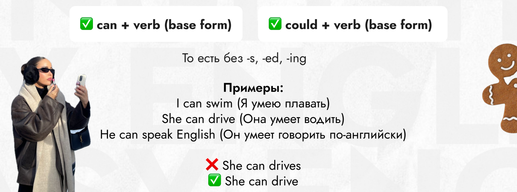 1) Главное правило: после can/could глагол всегда в базовой форме