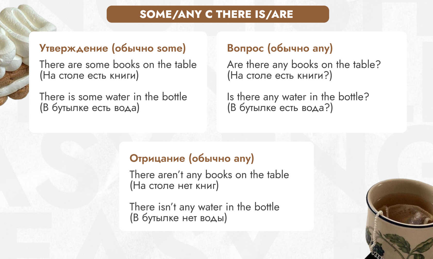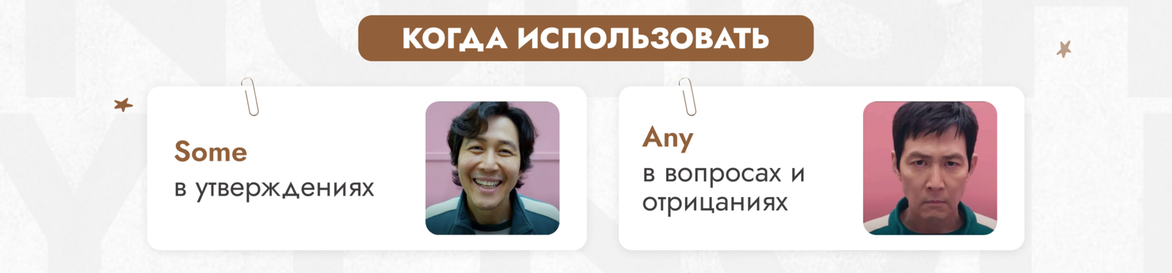 Если ты совсем новичок: запомни пока только “any = вопросы/отрицания”.